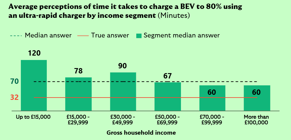 While consumers generally overestimate the time it takes to charge a BEV to 80% using an ultra-rapid charger, the lowest income groups believe that this takes significantly more than an hour, while those on the highest incomes believe the figure to be closer to an hour.