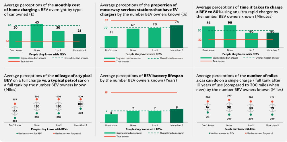Our analysis shows that people that have experience driving a BEV hold significantly more positive attitudes towards BEVs and have fewer misperceptions around their use. This is also true to a lesser extent for hybrid drivers.